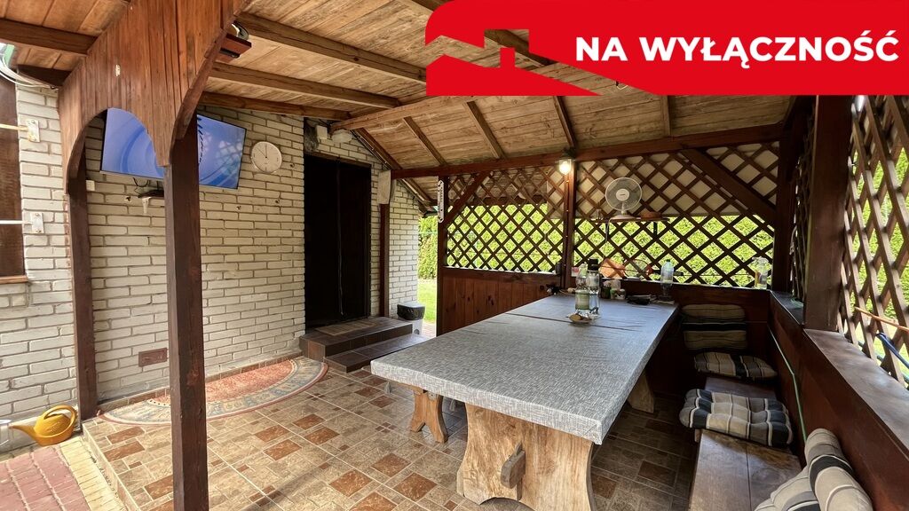 jest zadaszony taras o pow. 11 m2 z solidnym stołem oraz telewizorem.