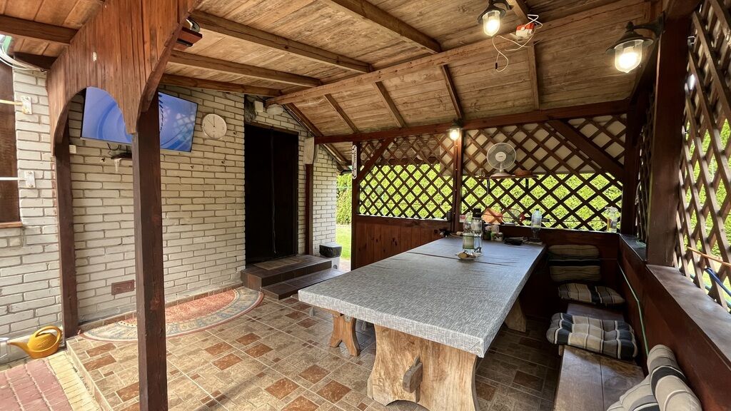 jest zadaszony taras o pow. 11 m2 z solidnym stołem oraz telewizorem.